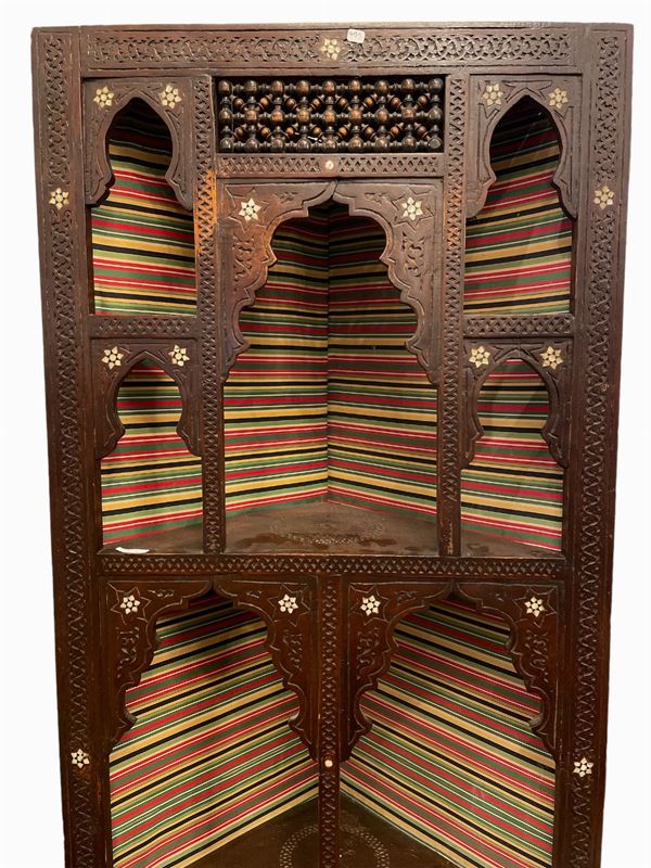 A 3 ripiani. In legno intagliato a motivi orientali con intarsi in madreperla. Difetti e mancanze.