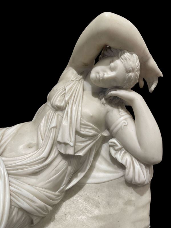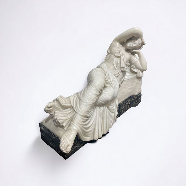 Scultura in volume in marmo bianco statuario, su base in Portoro. Soggetto tratto dall'Antica Roma di gusto neoclassico. Rotture e restauri, mignolo della mano destra mancante