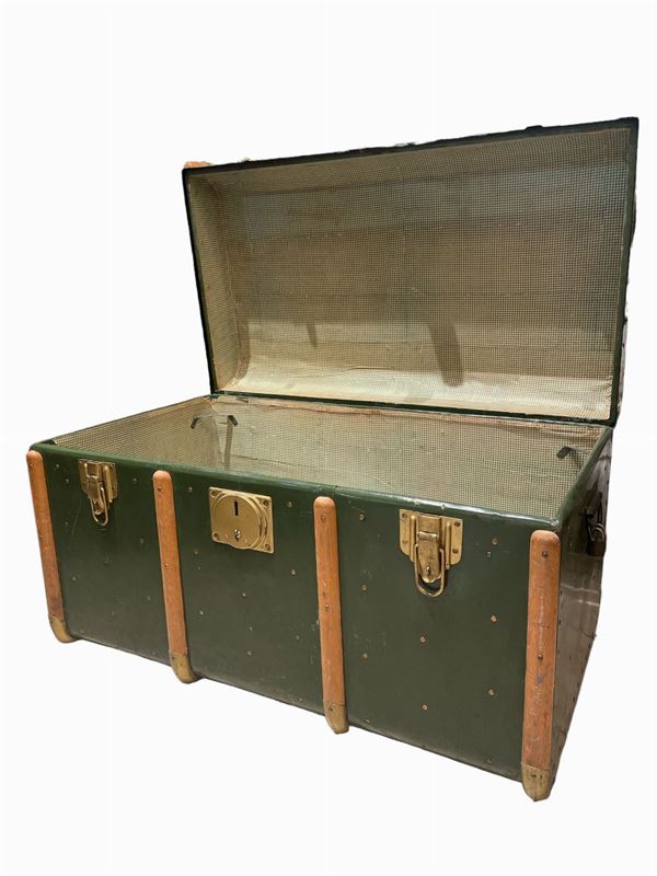 In legno e parti rivestite in lamiera di colore verde. Piccoli difetti e mancanze.