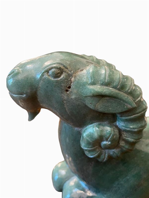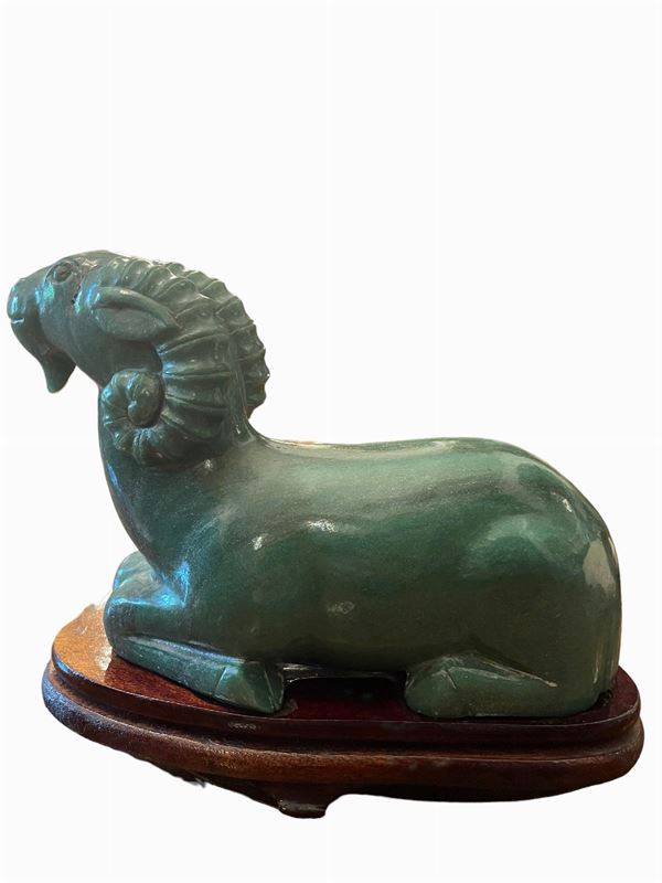 Scultura in forma in materiale lapideo, giadeite, con basamento in legno. Arte dell'Estremo Oriente.
