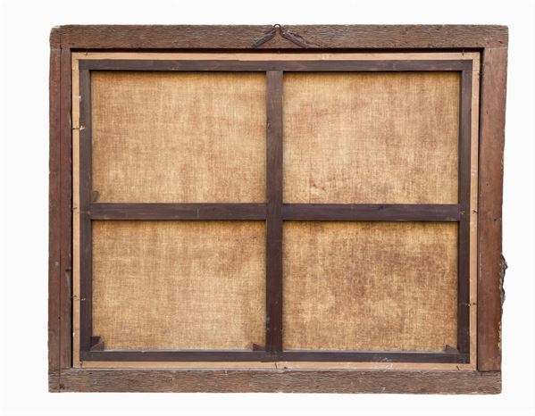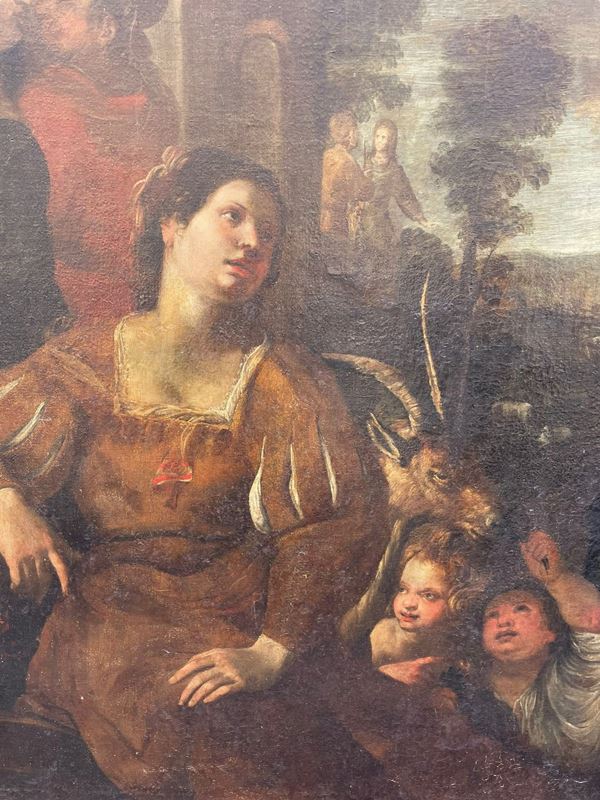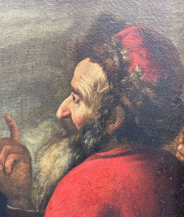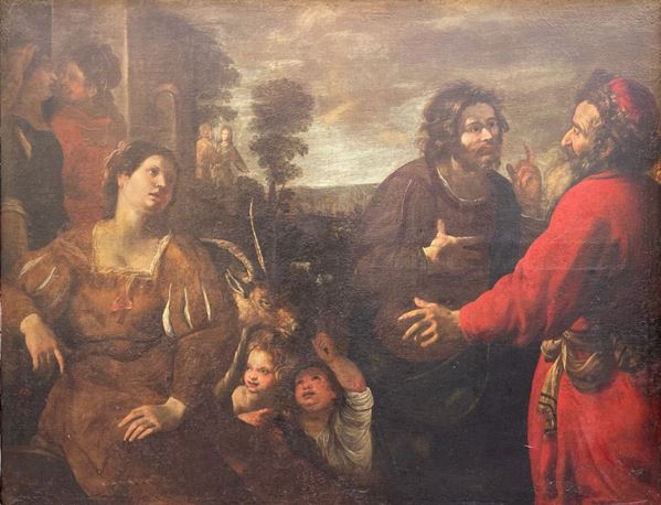 Il soggetto di questo inedito dipinto presenta il brano biblico tratto dal libro della Genovesi (31, 36-42) che narra della fuga di Labano dalla casa del suocero Giacobbe, che aveva servito per tanti anni per potere avere in moglie la bella figlia Rachele.
