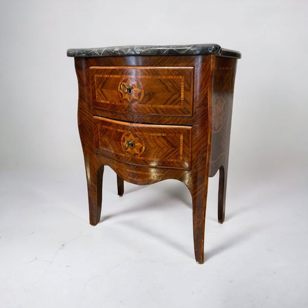 in legno di noce, con intarsi in legno di rosa. Due cassetti con traversa. Con piano superiore in marmo portoro. Di linea Luigi XV