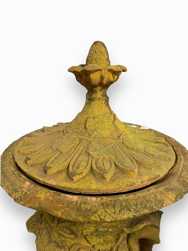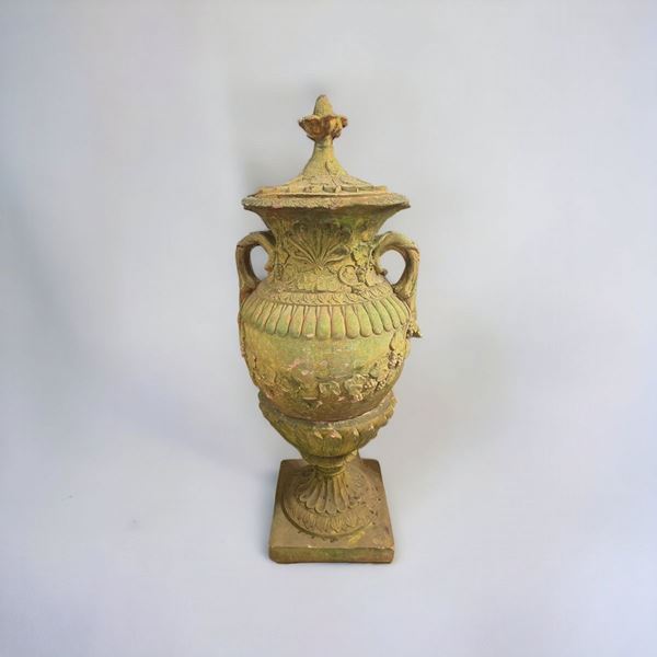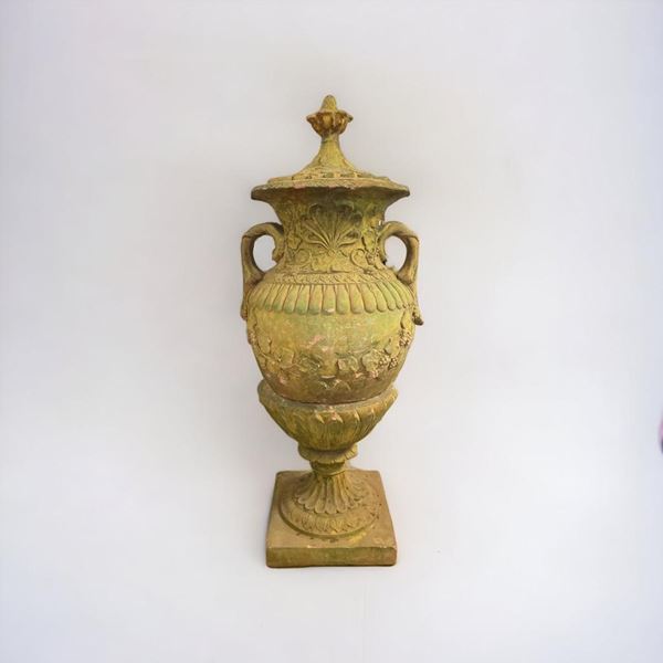 Con decori a tralci d'uva e fogliame, con due anse laterali e coperchio superiore. Restauri e mancanze.