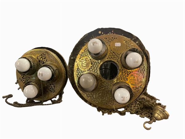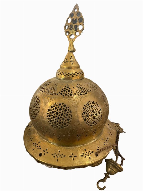 In ottone reticolato con decori a traforo e iscrizioni. Piccoli difetti.