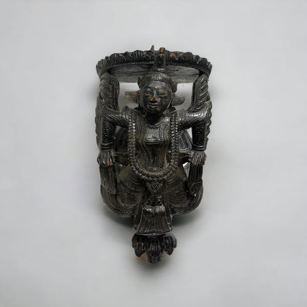 In legno ebanizzato, a forma di divinità orientali. Piccoli difetti.