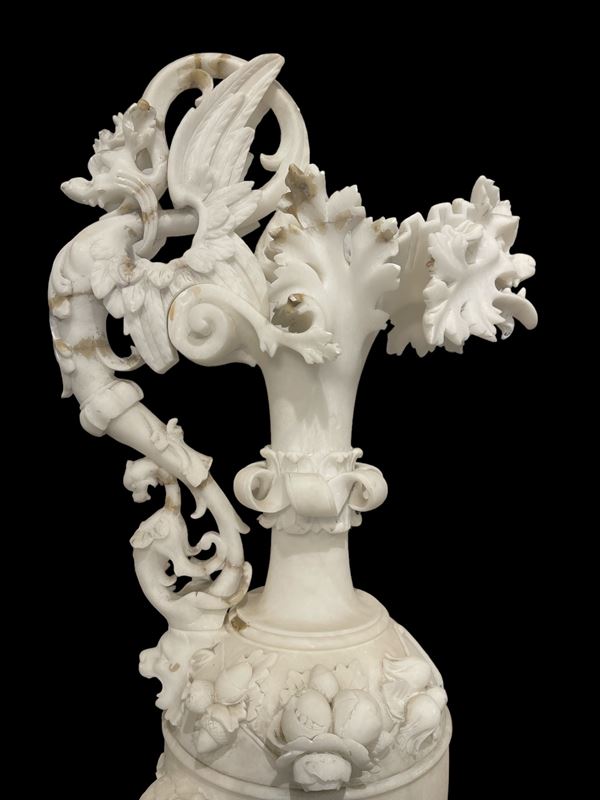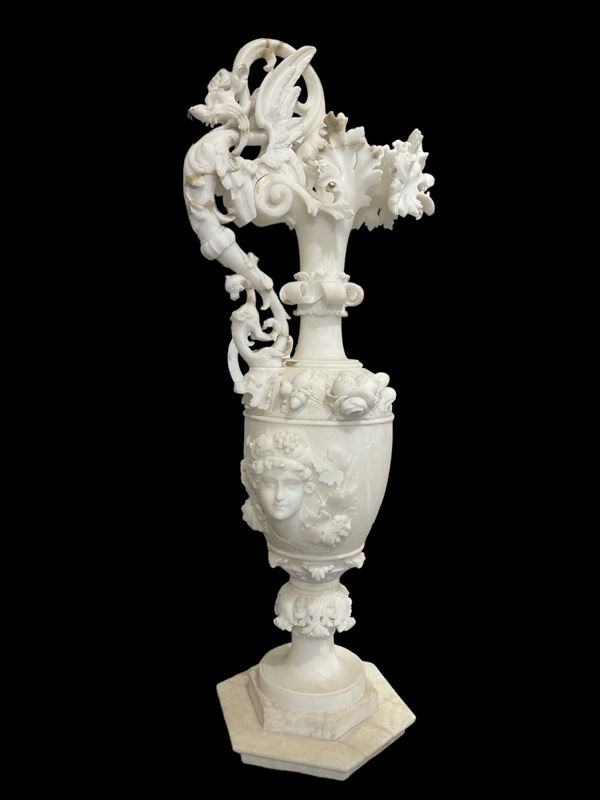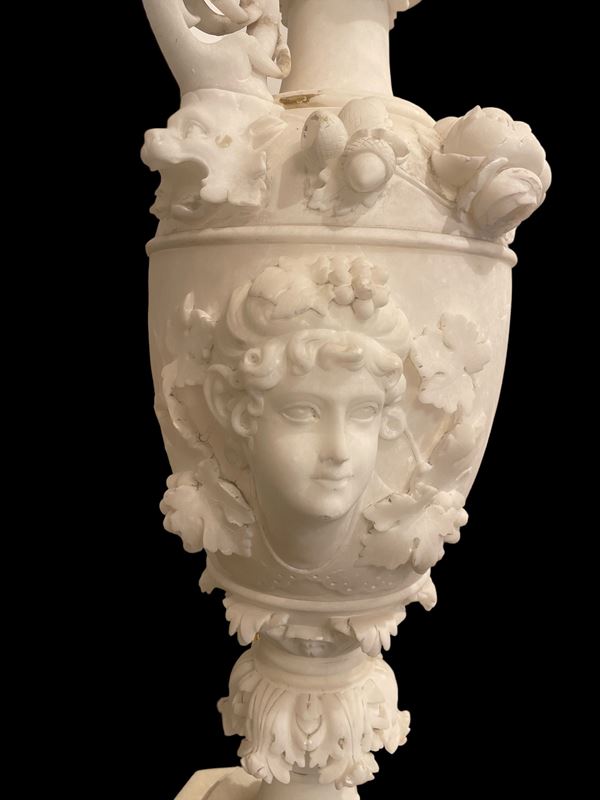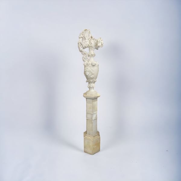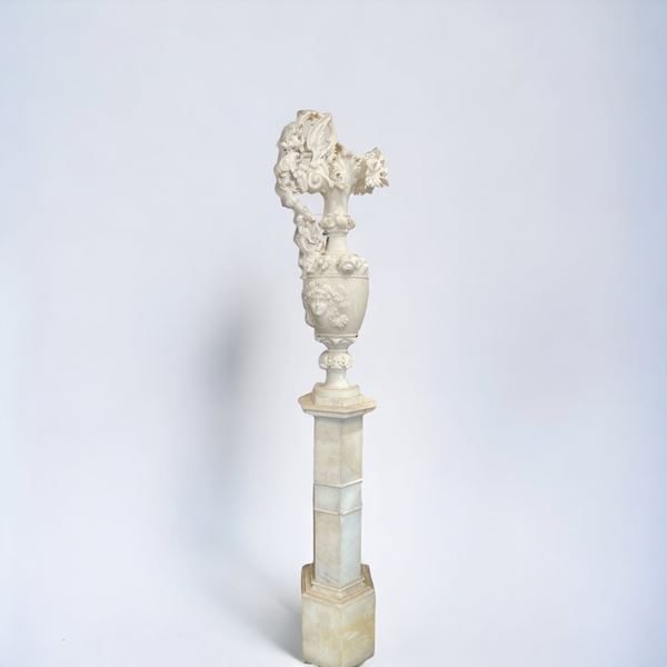 in alabastro riccamente scolpito, su basamento esagonale. Restauri e mancanze. Manifattura italiana