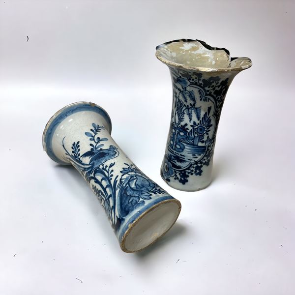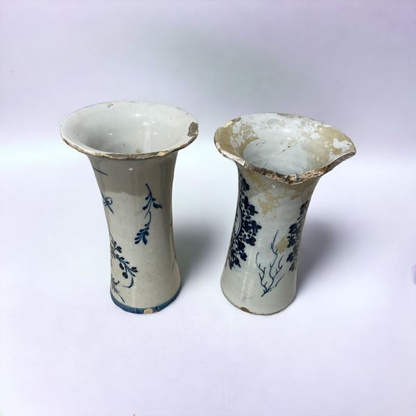 A tromba, in ceramica bianca con decoro floreale blu. Delft, fine XVIII - inizio XIX secolo. Mancanze e rotture.