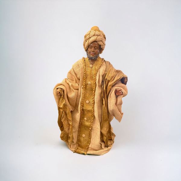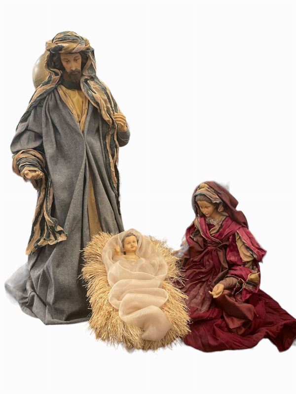 in cartapesta e terracotta. Composto dalla sacra famiglia (Gesù, Giuseppe e Maria) e tre re magi. Rotture e mancanze. Abbigliamento d'epoca