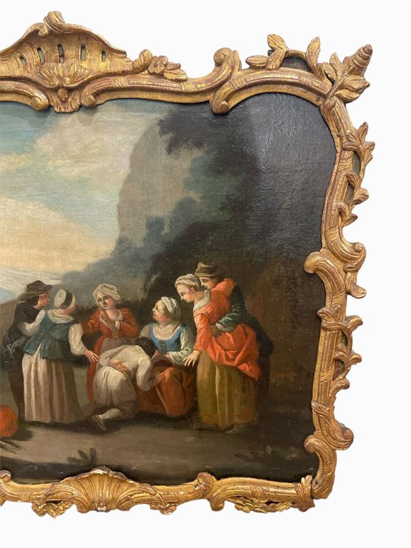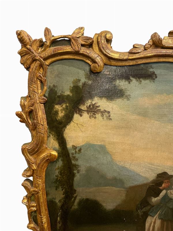 Sovraporta. In cornice coeva in legno dorato ed intagliato a motivi floreali.