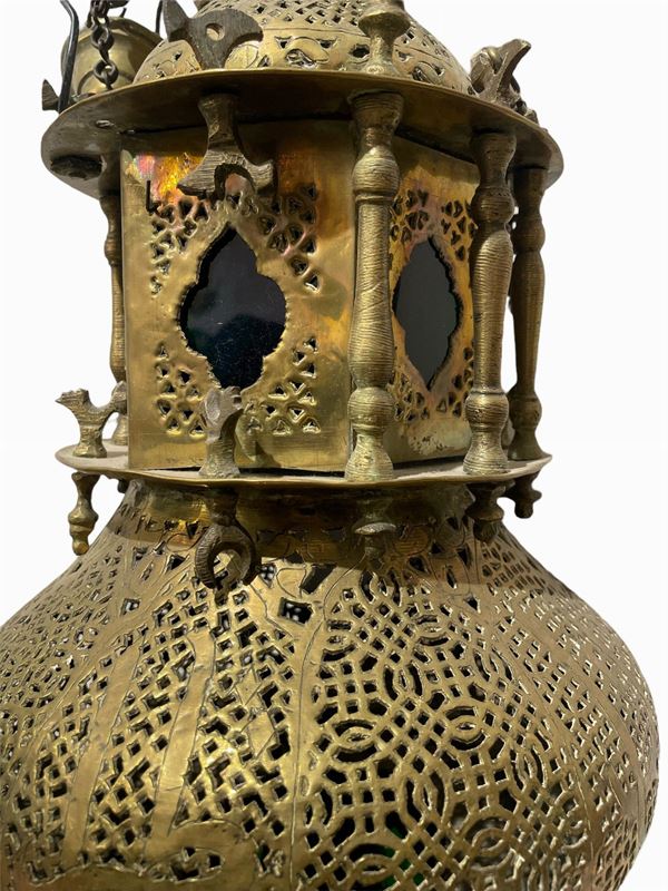 A forma di lanterna, in ottone reticolato con iscrizioni e lati vetrati multicolore separati da colonnine.