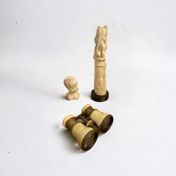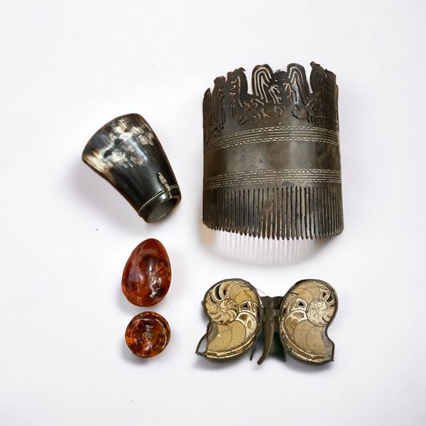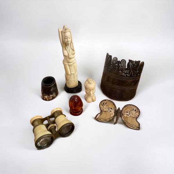 In materiali diversi. Di cui un fermacapelli, due sculture in resina, un uovo in pietra dura, una farfalla in pietra fossile e un cannocchiale.