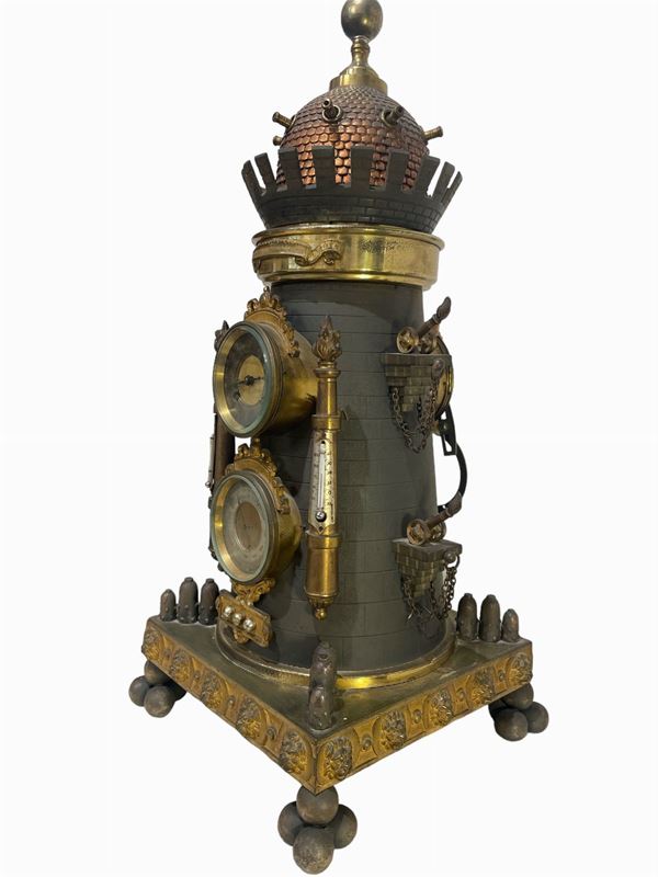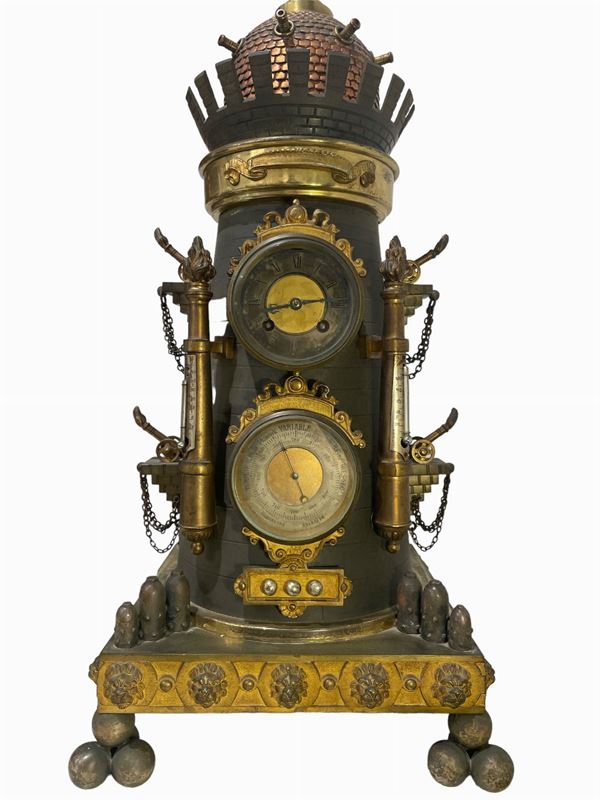 Orologio e barometro da tavolo in bronzo dorato e brunito, con parte superiore ruotante. Firmato Japy Freres. Manifattura francese. Meccanica d'origine da revisionare.