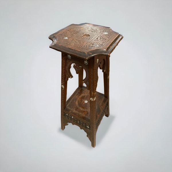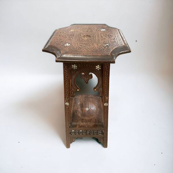 In legno intagliato a motivi orientali con intarsi in madreperla. Difetti e mancanze.