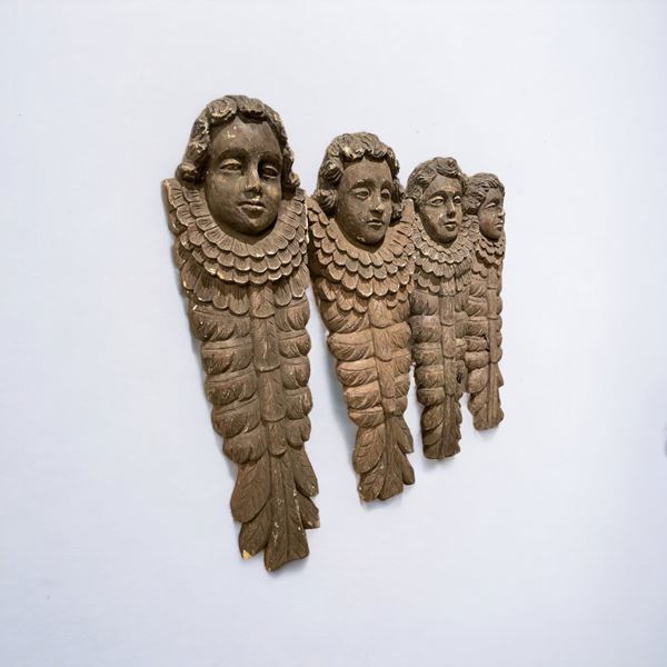 Sculture in legno di castagno scolpito e laccato, con volti a forma di putto.