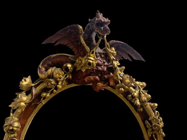 con legno intagliato a decorazioni floreali, laccato, con lumeggiature dorate. Mascherone alla base e cimasa con grifone alato.