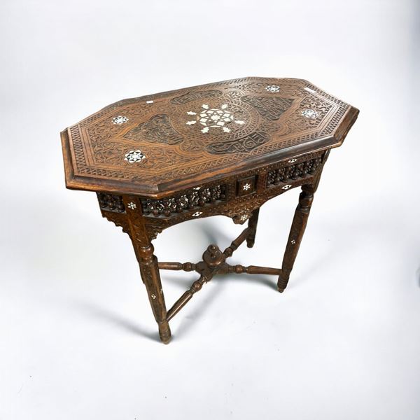 In legno intagliato a motivi orientali con intarsi in madreperla.