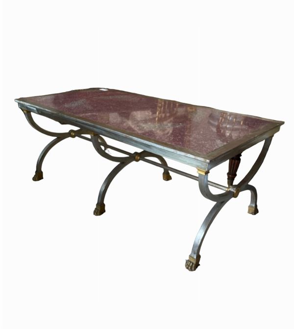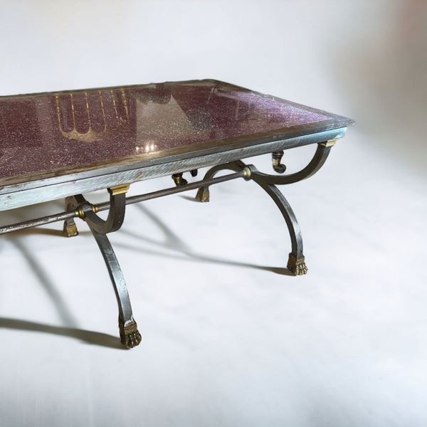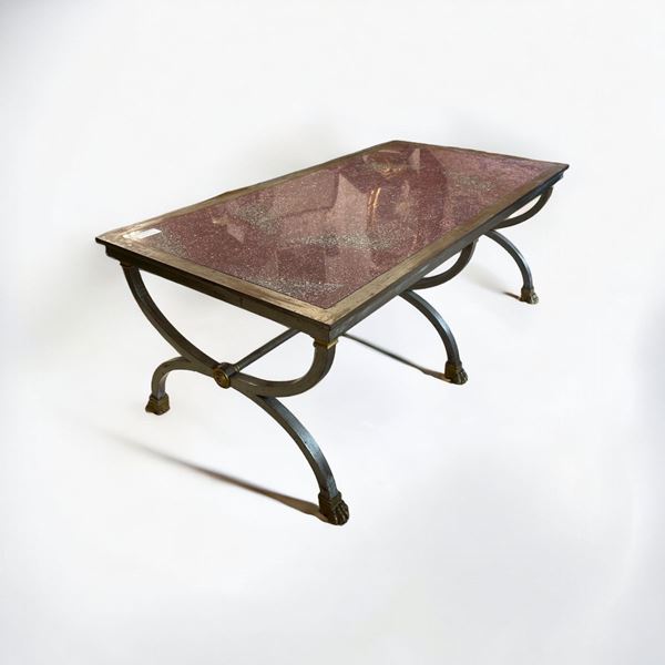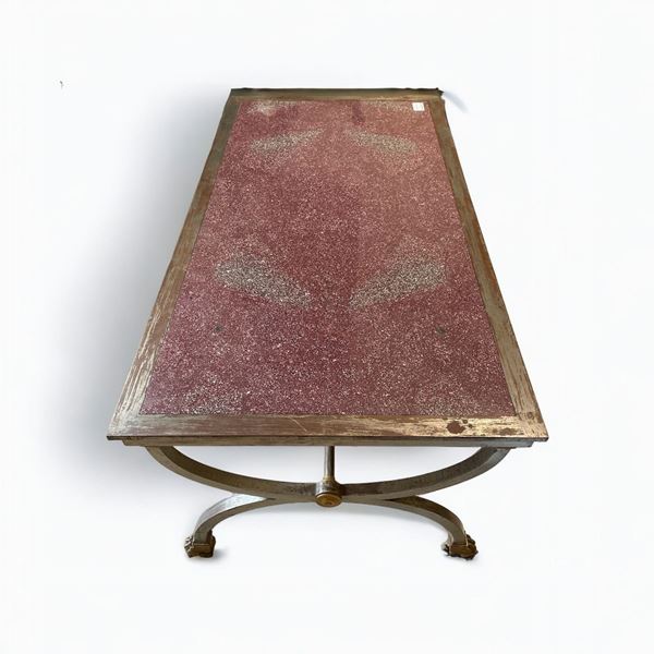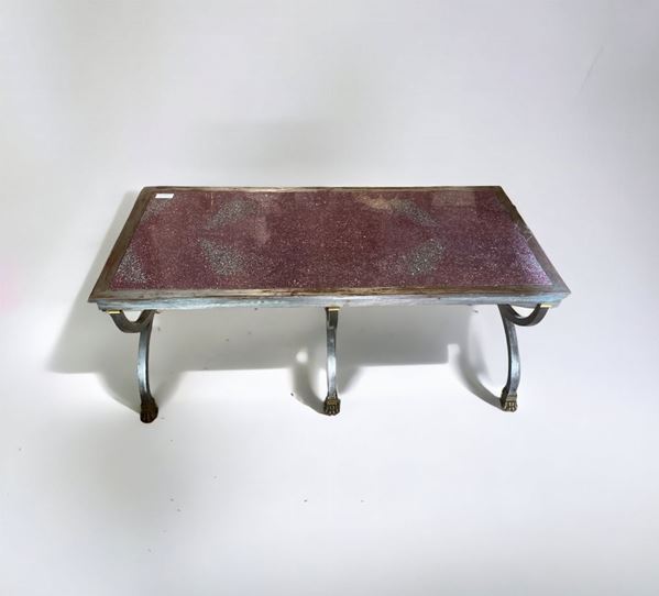 tavolino in ferro battuto con applicazioni in bronzo e piano in marmo in porfido rosso antico.