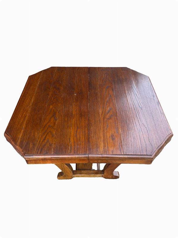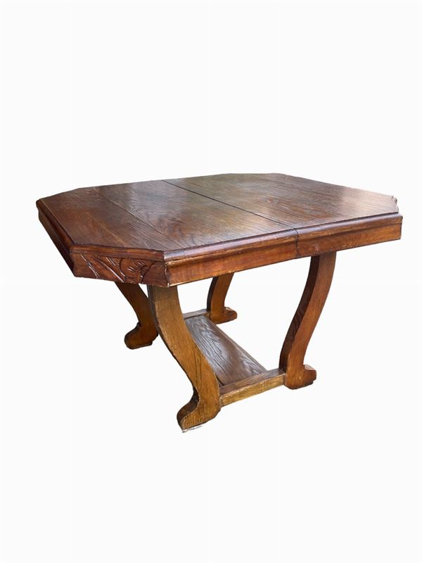 Con piano allungabile. In legno di rovere, con angoli smussati, decorazioni liberty.