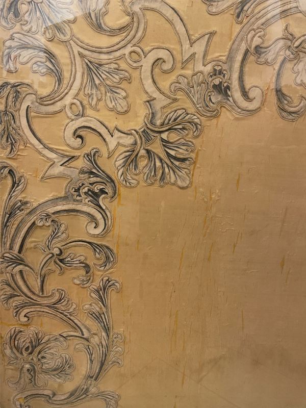 Tessuto in seta, con applicazioni e passamanerie. Montato su pannello. In cornice.