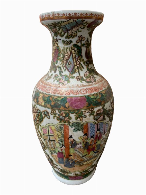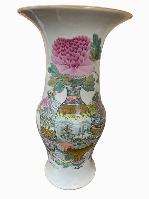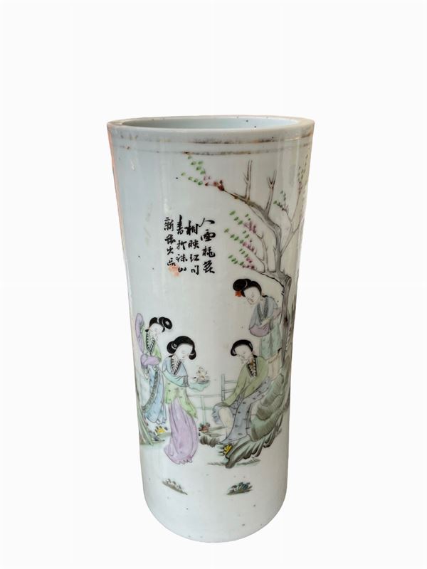 DI cui un portapennelli in porcellana bianca con versi di poesia orientale e due vasi in porcellana policroma. Dimensione massima: 39 x 13 cm