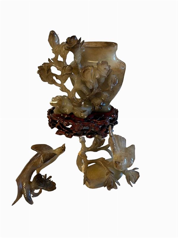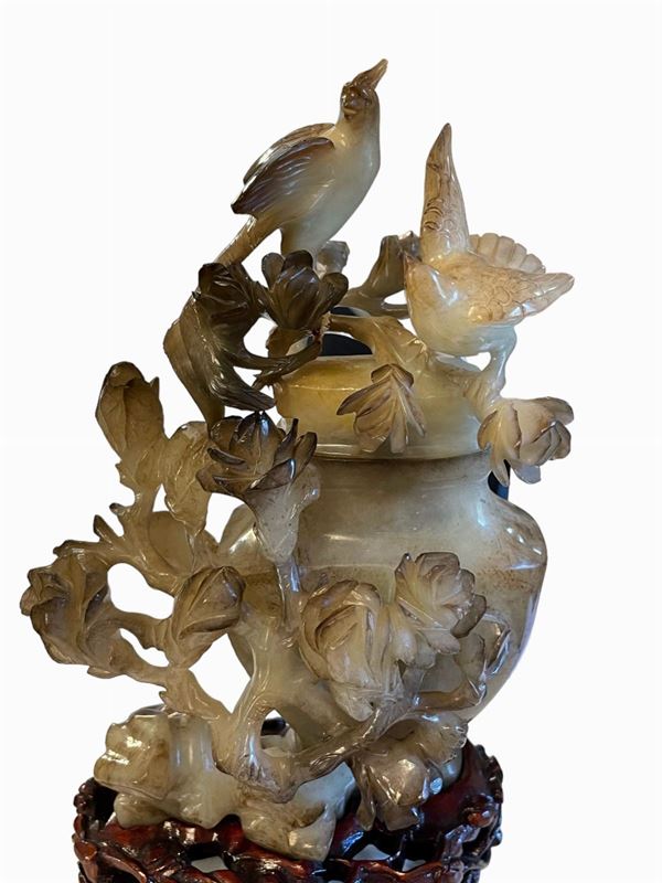 In giadeite grigia, con elementi fitomorfi e coppia di volatili, su base in legno, scolpito e traforato. Arte dell'Estremo Oriente. Rottura al coperchio.