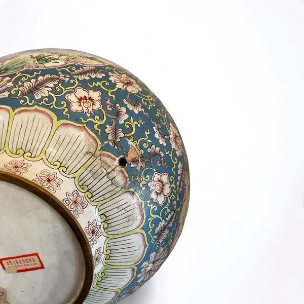 In rame smaltato policromo con decorazioni di scene campestri orientali e motivi floreali. Segnato alla base