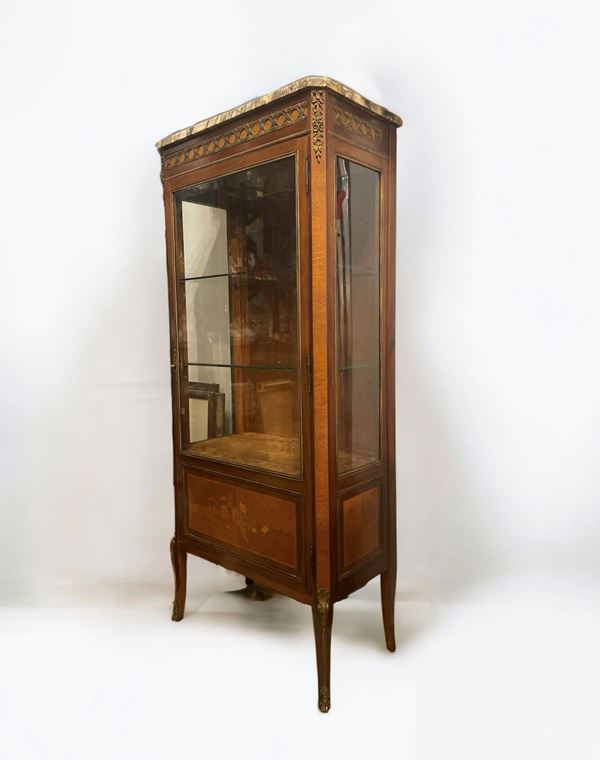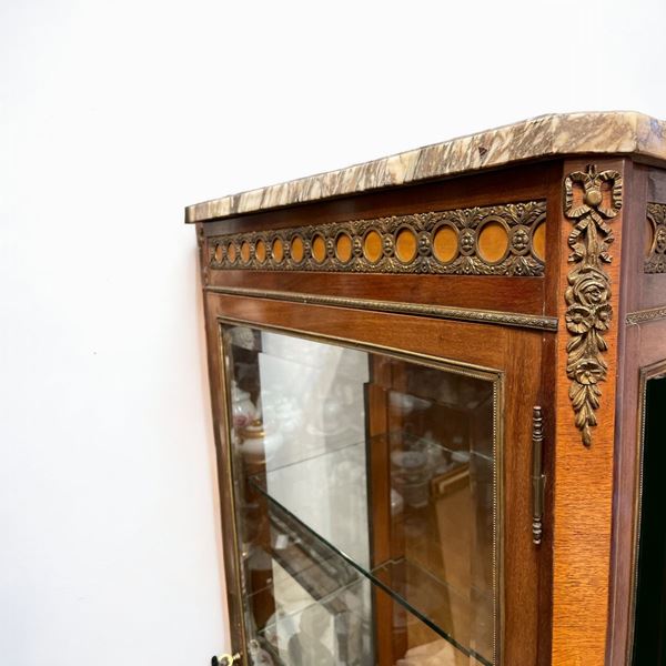 ad anta unica, in legno di mogano, con decorazioni bronzo dorate, e piano superiore in marmo di fior di pesco.