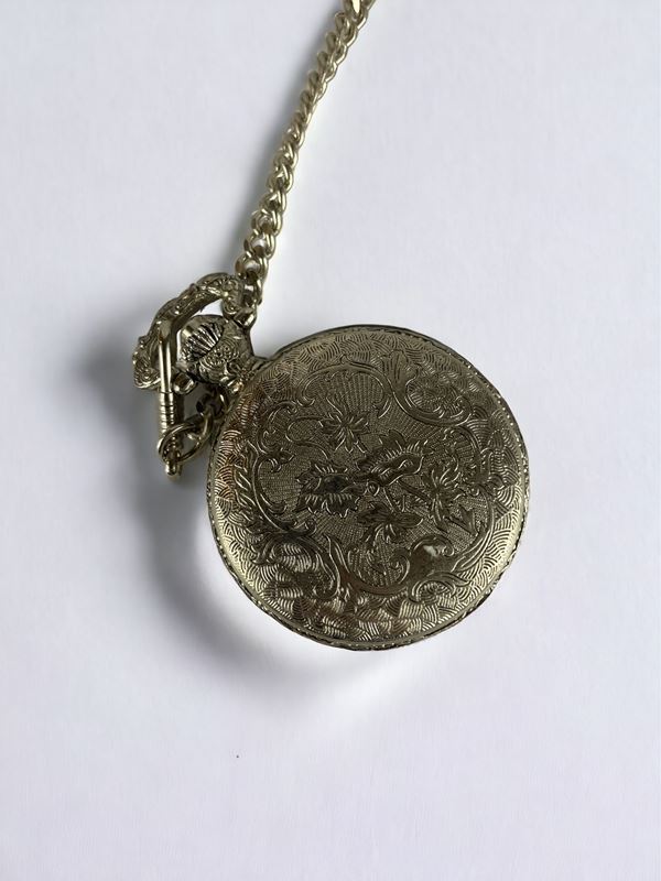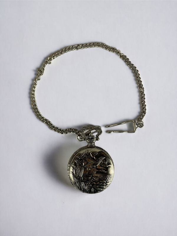 Carica manuale, cassa in acciaio con fondello cesellato con motivi floreali, cassa anteriore con anatre in rilievo.