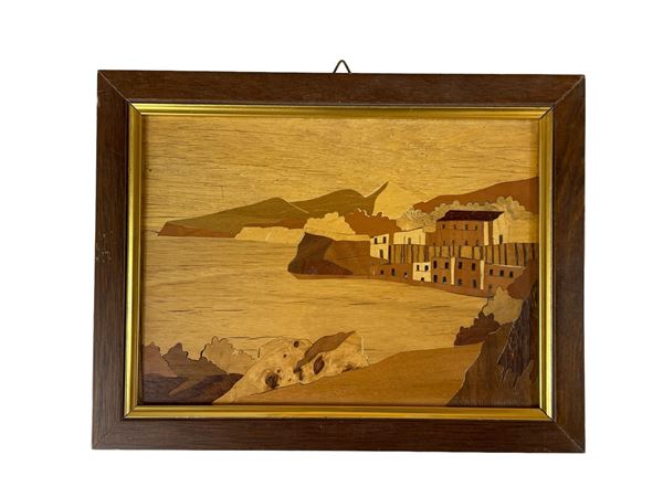 Insieme di quattro paesaggi uguali a coppie a tarsia lignea.