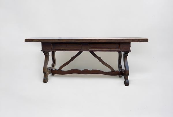 Mobile in legno di noce a due gambe a lira accordate alla base, con due cassetti nella fascia marcapiano. Con elementi antichi, XIX / XX sec.