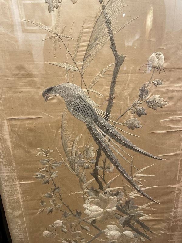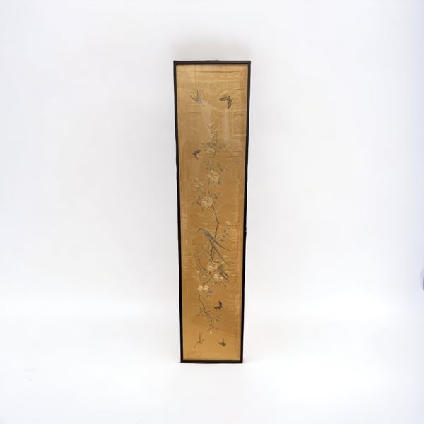Con ricami raffiguranti volatili, farfalle e rami di fiori. In cornice.