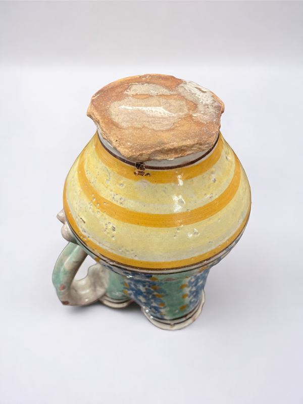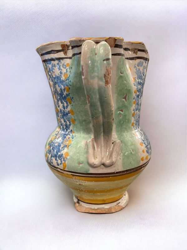 con bocca smerlata decorato in toni verde e blu. Mancanze.