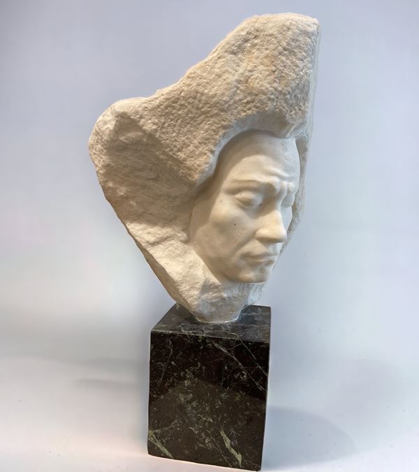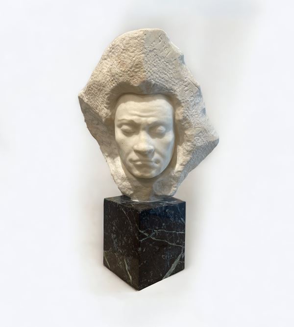 Scultura in marmo bianco statuario raffigurante Beethoven, con base in marmo.