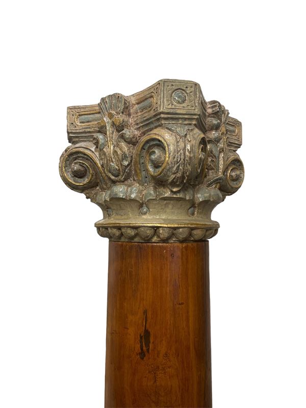 In legno dolce tinto a noce, con capitello in legno scolpito e laccato a tinta celeste e lumeggiature in oro. Basamento in pietra scolpita.
