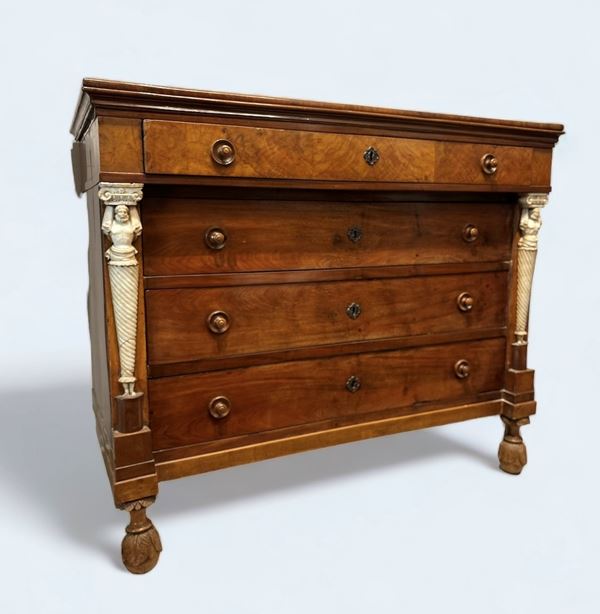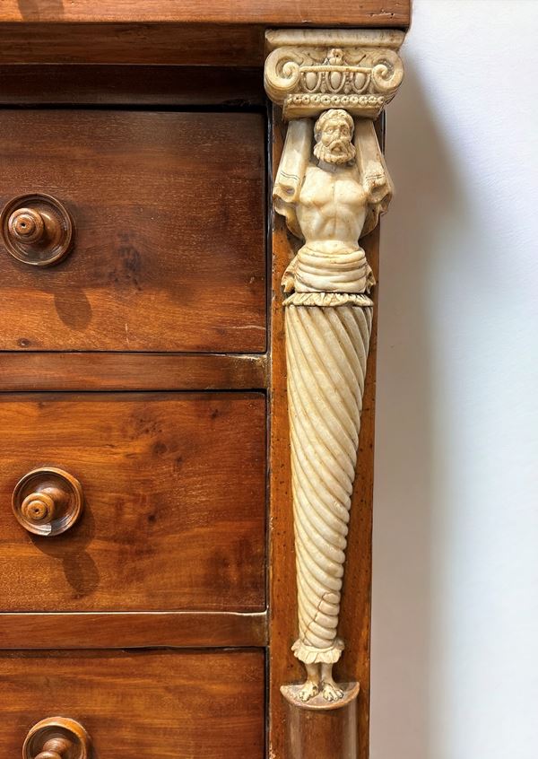Commode in noce con cariatidi in marmo, prima metà el XIX secolo