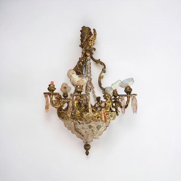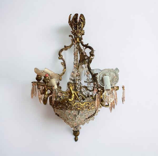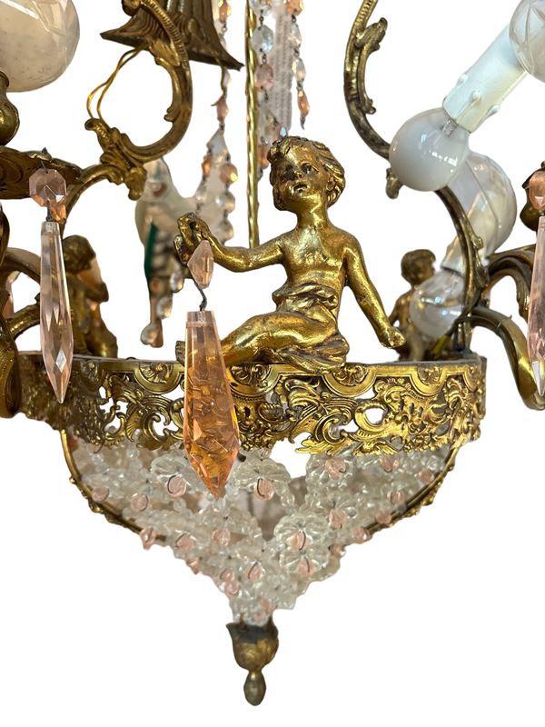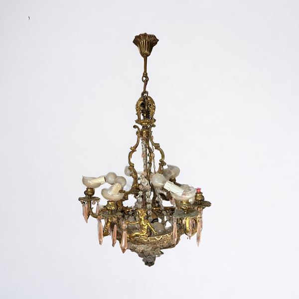 a 6 luci, in bronzo dorato e vetro, intrecciato a nido d'ape, con putti a sormontare la cintura laterale. Piccole mancanze