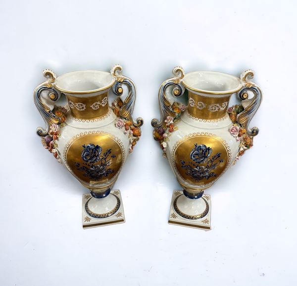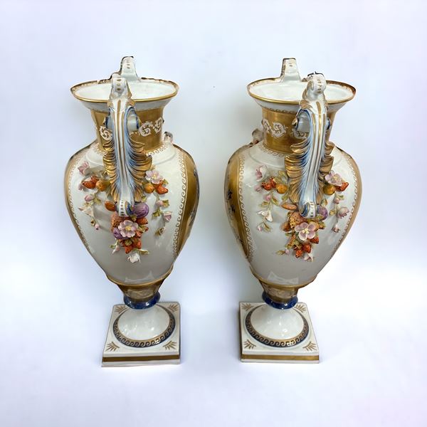 Coppia di vasi biansati in porcellana dipinta - Sevres, XX sec.
