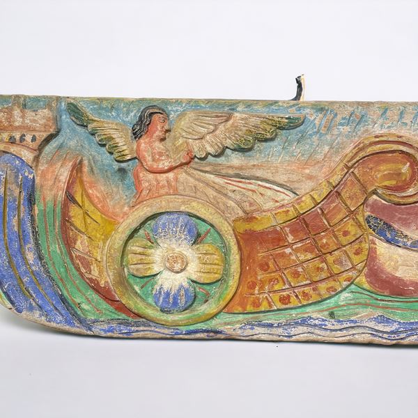antica sponda di carretto siciliano, in legno dolce tinto, intagliato e dipinto.