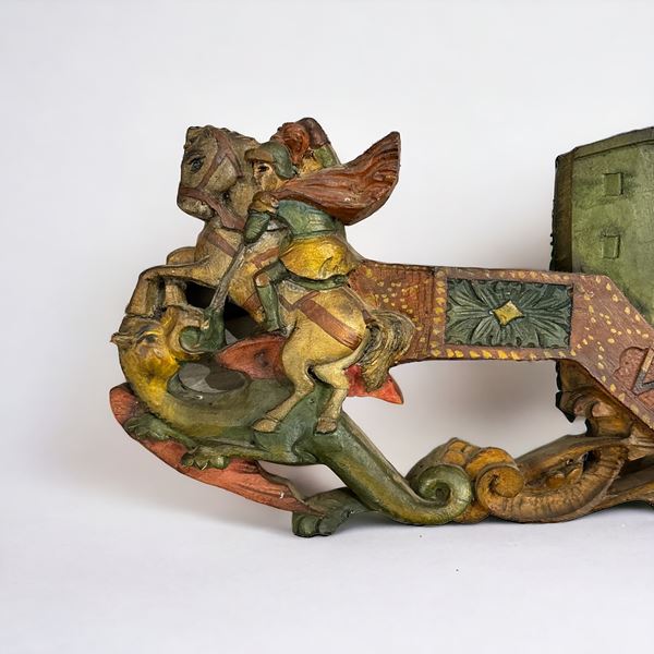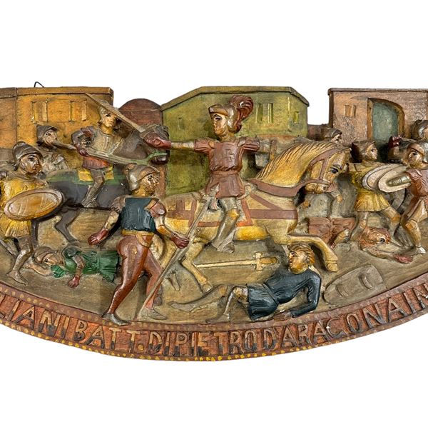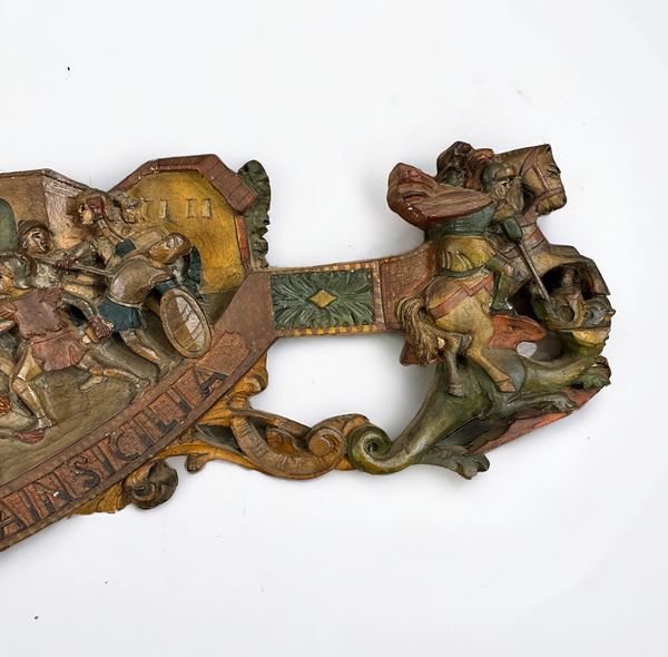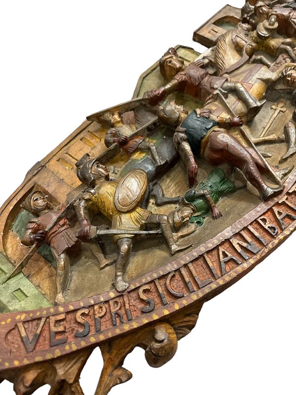 in legno intagliato ad alto rilievo e decorato a policromie. Con iscrizione "Vespri Siciliani Bat. di Pietro d'Aragona in Sicilia"