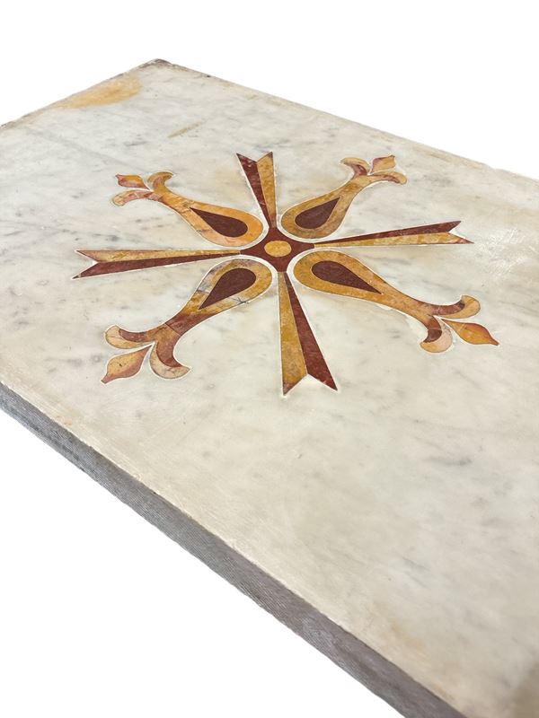 In marmo bianco intarsiato in pietre dure varie a motivi geometrici. Difetti.