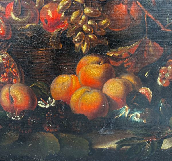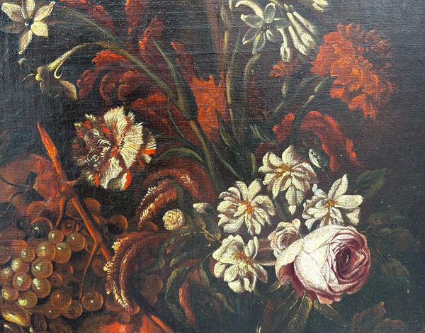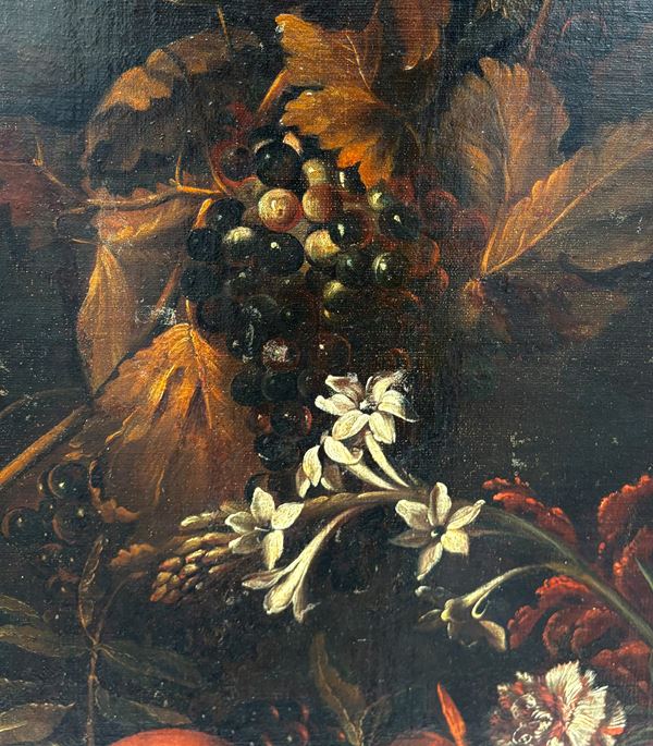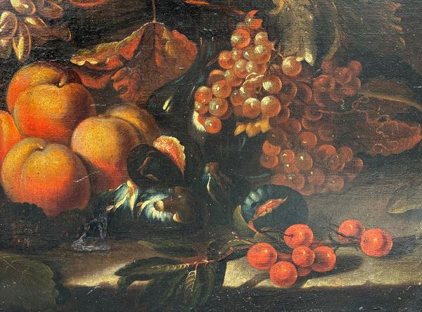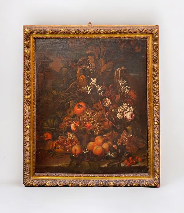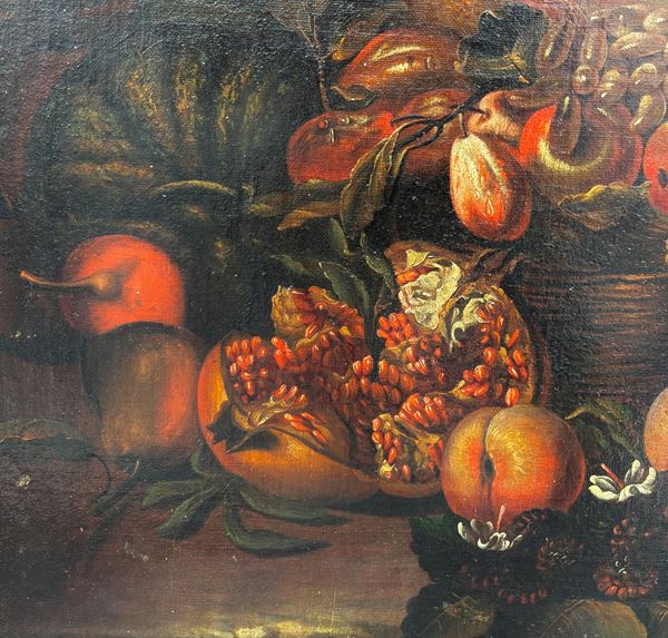 Natura morta con frutti (melograni, pesche, uva, ciliegie e fichi), fiori di sambuco, gigli, zannie rosse, rosa e verdure, Scuola napoletana, seconda metà XVII secolo