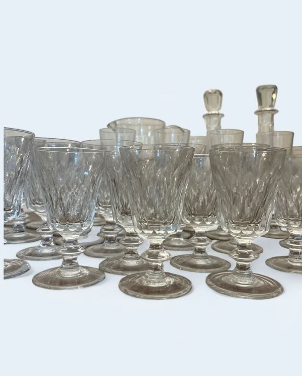 In cristallo molato. Composto da 1 caraffa, 2 decantar con tappo, 12 flûte, 10 bicchieri da acqua, 11 bicchieri da vino, 12 bicchieri da liquore.