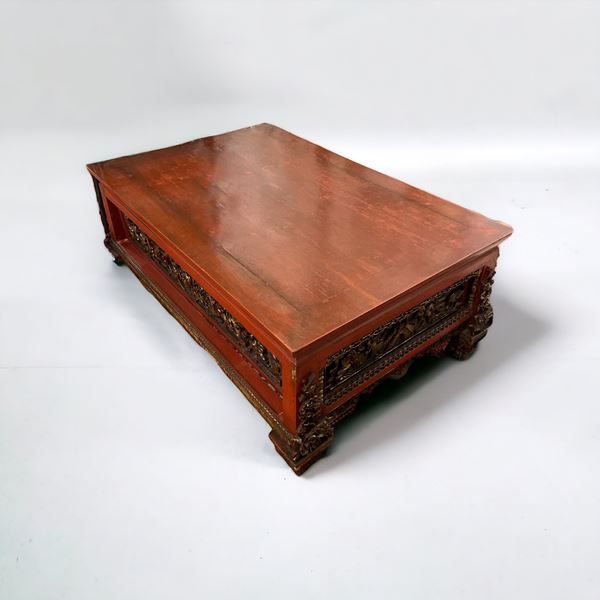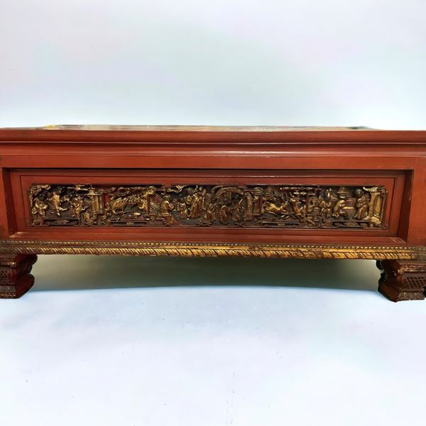 in legno leccato rosso. Cina, intagliato ad alto rilievo con scene di vita quotidiana. Piccoli difetti.