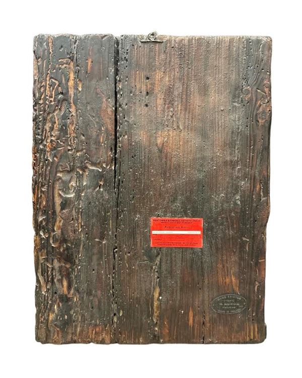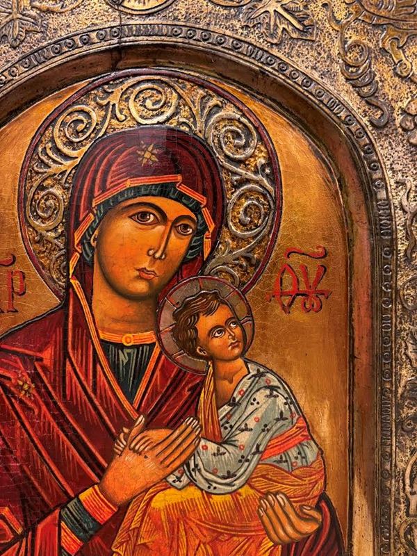 Con cornice e aureole in argento dorato con decorazioni a sbalzo.