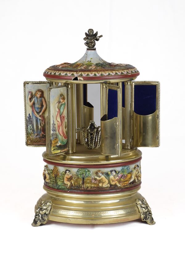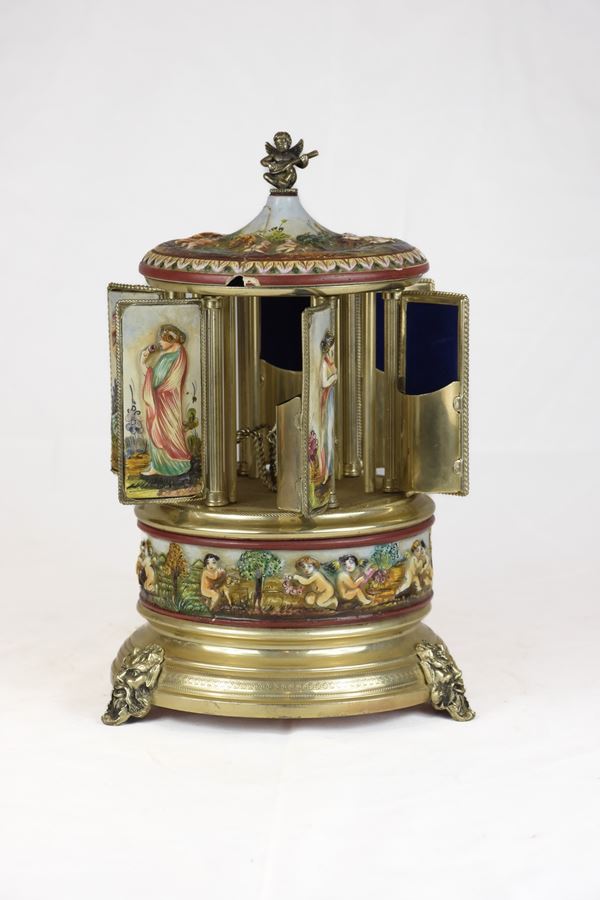 Scatola con sei scomparti a carillon, di forma circolare, con tre piedi d'appoggio a mascherone e puttino sulla sommità. Con placche di ceramica policroma a figure femminili e amorini che giocano, lungo la cinta inferiore sugli sportelli degli scomparti che si aprono e si chiudono e sulla sommità. Parti rotte e rincollate. Non marciante.