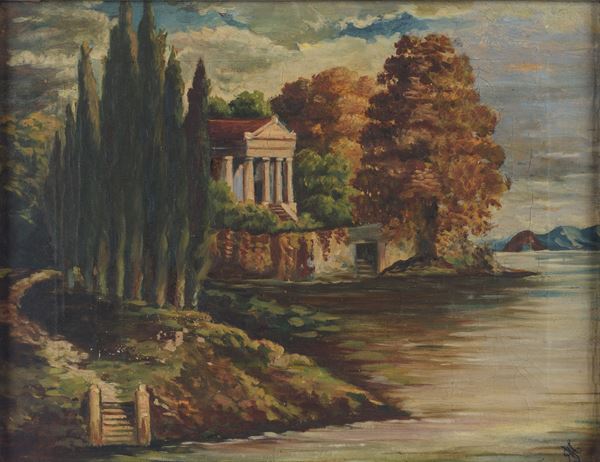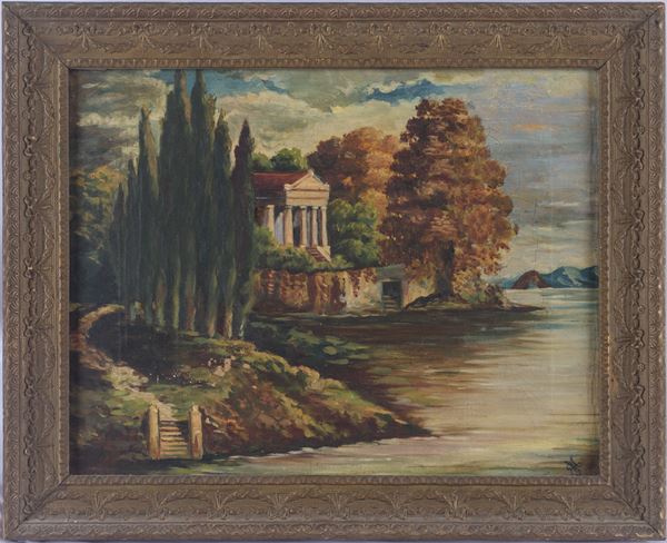 Veduta di villa palladiana con corso d'acqua. Siglato in basso a destra H. R. (forse Hermann Traugott Rüdisühli). In cornice.
