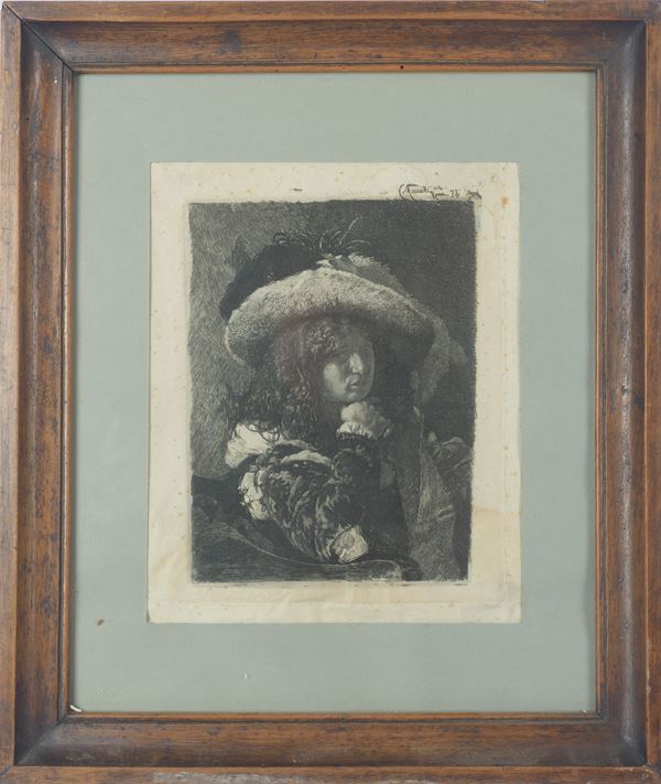 Firmata in lastra in alto a destra. Foxing. In cornice.