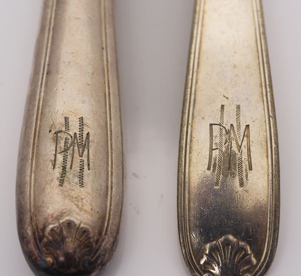 Composto da: 36 forchette, 36 coltelli e 36 coltelli da pesce. Con motivo a conchiglia e incisione delle iniziali dell'Hotel Punta Molino di Ischia "HPM".
