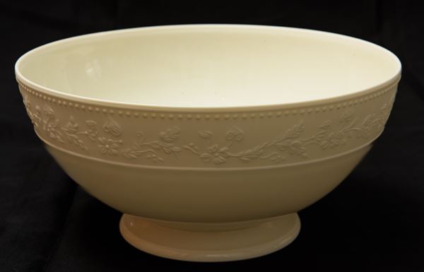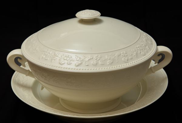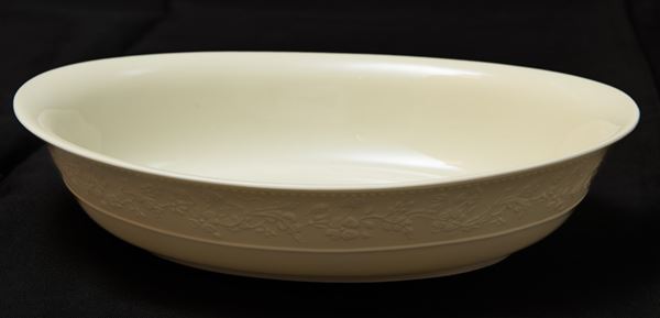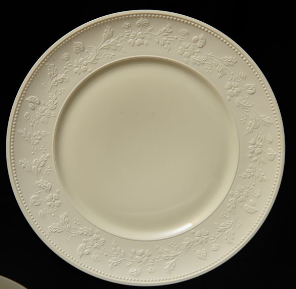 55 pezzi. Composto da: 24 piatti piani; 12 piatti fondi; 12 piatti da dessert; 1 piatto da portata rettangolare, largh. 38 cm; 1 piatto da portata rotondo, D. 31 cm; 1 piatto da portata rotondo, D. 29 x H. 5,5 cm; 1 coppa con piede, D. 24 cm; 1 zuppiera, 2 ciotole ovali, largh. 23,5 cm. Marchio della manifattura alla base. Conservazione: Ottima