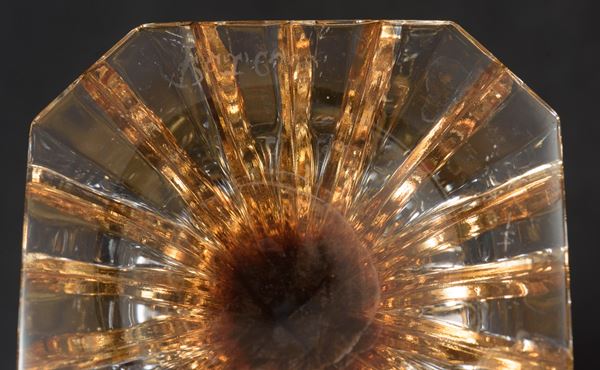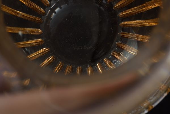37 pezzi. Composto da: 12 calici, H. 17 cm; 12 flûte, H. 20 cm; 12 calici, H. 16,5 cm; 1 caraffa; H. 19,5 cm. Firma incisa all'acido alla base: Pierre Cardin.